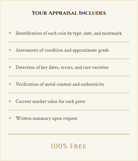 Yes, completely free with no catches. We do not charge for verbal appraisals regardless of collection size. We offer this service because we genuinely want to help people understand what their coins are worth, and we know that informed sellers often become our customers.